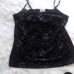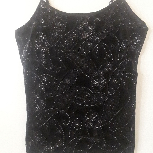 Black Velveteen with glitter silver, evening wear reversible straps a bra on inside there's a lot of stretch in the top in excellent condition only wore once for short time it still looks new no flaws .Smoke and pet free environment it does run smaller than a 1X