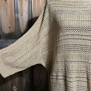 Chico’s travelers collection top/sweater tunic has 3/4 sleeves and side vents, knit/crochet knit fabric in a gold and metallic colors