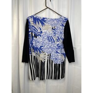 Chico's tunic shirt blouse top women's 12 black with blue periwinkle cream flowe