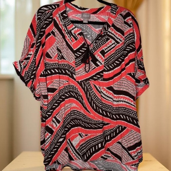 Chico's tunic top, Boho pattern,hot pink & black, long tassel tie on front SZ 16-18 or Chicos 3. The top has wide sleeves and flows in a casual style. The tassels ties can be warn in a bowtie or casually hanging tassels. The look is Art teacher,boho, summer,spring,barbecue, garden party look. ❤️ The pit to pit is 29