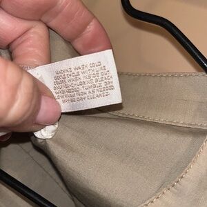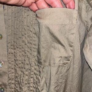 In good preowned condition tunic style top or mini dress with pleats and pockets. Freshly washed and air dried. Measurements pit to pit and shoulder to hem 24” inches & 34” inches approximately slightly longer in back. Long cuffable sleeves. Smoke and pet free home. Garment provides some stretch. Tan color.
