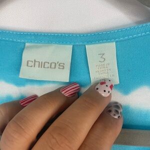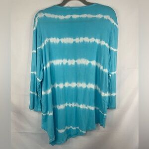 Chicos turquoise tie dye blouse with an a symmetrical hem line. Very stretchy.