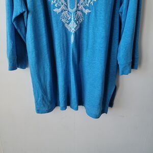 Chico's womens 100% Linen Embroidered V-Neck Tunic size XL Blue 3/4 sleeve