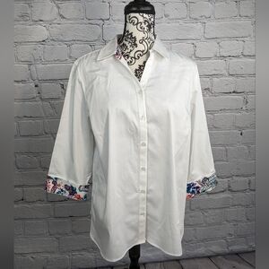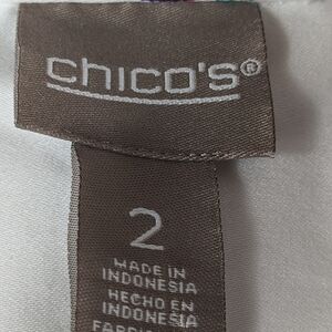 This is a women's brand new with tags long cuffed paisley print sleeve button front top that is made by chico's and comes in a size M.