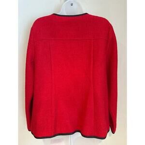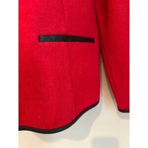 Chico's red wool blend zip up jacket, Chico's size 2. 70% polyester and 30% wool with black trim. Excellent condition.