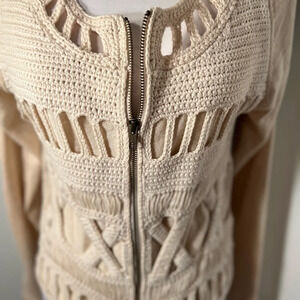 Chicos,1,(US M) Long sleeve front zip, open embroidered, rounded neck cardigan