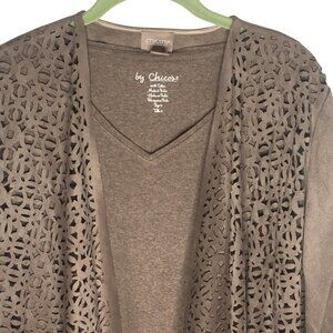 Chicos2 Piece Cardigan Jacket Set Womens L Brown Faux Suede Laser Cut Layering