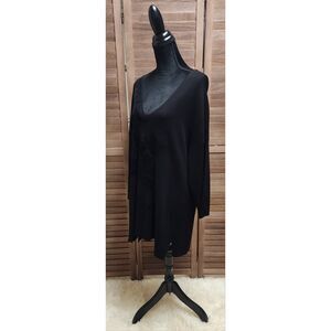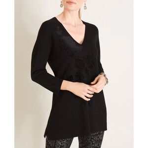 Chico's 2 Velvet-Applique Floral Sweater Large L Long Black V-Neck Tunic Top