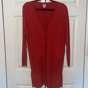 Rust colored Chicos two piece tank and long jacket/cardigan. Stretchy material. One small pull on shoulder of tank, photo included. Overall in excellent condition. Chicos size 2