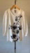 White blouse with black floral print and sequins arranged asymmetrically on the front.