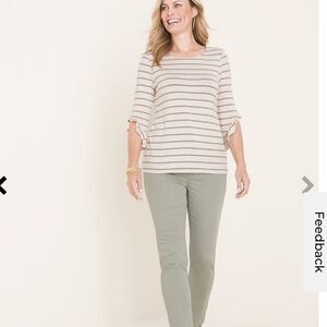 Chicos Beige Striped Ruffle Elbow-Sleeve Top Round Neck Rayon Blend 1 medium
