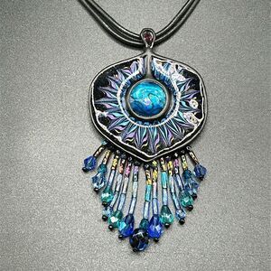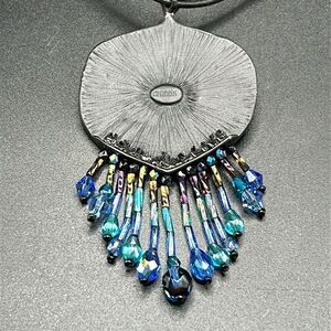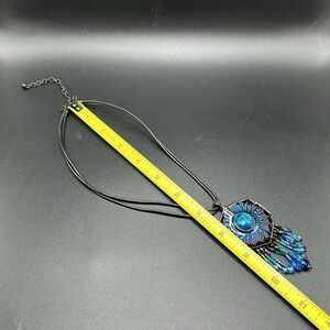 Chico’s Black Blue Peacock Kaleidoscope Pendant Necklace Leather Cord