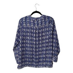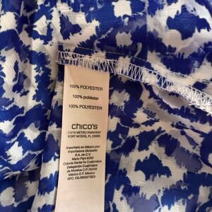 Experience the elegance of Chico's with this blue and white blouse, featuring a chic mandarin collar and 3/4 sleeves. The buttoned design adds a touch of sophistication, while the lightweight fabric ensures a comfortable fit. Perfect for both casual and formal occasions, this blouse is a versatile addition to any wardrobe.