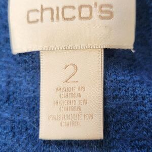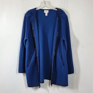 Chico's blue wool blend jacket. Size 2 (12). (This jacket runs big). Faux leather black trim. Zips in the front with two pockets. No flaws... Excellent condition !