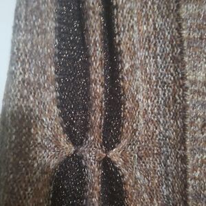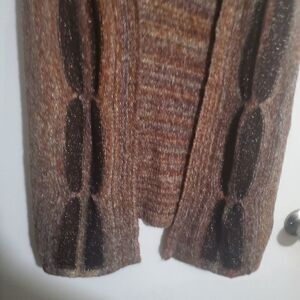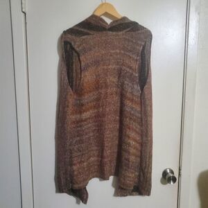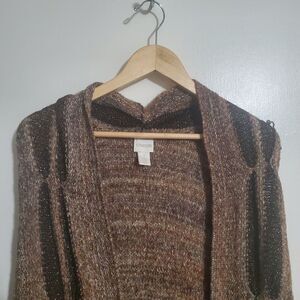 Brown tones sleeves, knit, open cardigan sweater vest. Oversized. Great for fall and winter. Pre-owned in overallgoodcondition. *Small imperfection on shoulder as pictured. According to Chico's conversion chart Size 1 it's a medium in a conventional size.