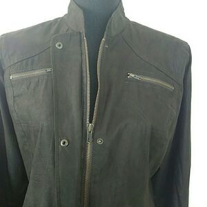 Chico's brown jacket with suede look, hidden zipper and snap front closure, fully lined.