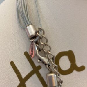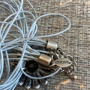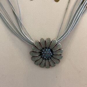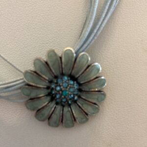 Color is light gray and silver with the pendant of the flower with light blue rhinestones