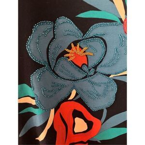 Cotton and spandex knit. Round neck. Pleats at shoulders. Two front upper flowers have beading. Pit to pit measure is 26 inches. Length is 27 inches.