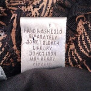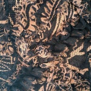 This unusual jacket is very special. Silk blend. Black and warm tan background is embellished with ruffly strips of self fabric, black net and sequins. A soft plaid emerges. Soft lining. Open front. Size 1 (8-10) measures 48 at chest, 46 at bottom hem. 25 long from shoulder to hem. Sleeves 23. A beautiful finish for your special occasion.
