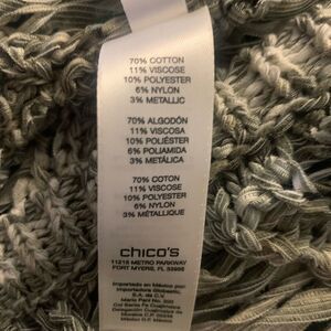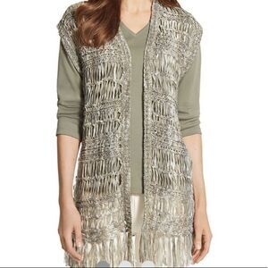 Chico’s Fearless Fringe Lely Vest. We love a long vest with artistic style. The macrame crafting is fabulous with a fringe finish. 65% acrylic / 35% nylon. Hand-created. Perfect condition. Size 00 (Chico’s XS). Length approx 29”. Olive/tan in color