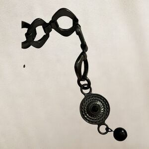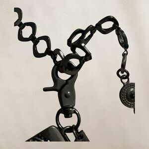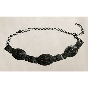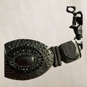 Chico’s gun metal Black Rhinestone Link Belt. Gun metal link belt is adjustable to 50 inches in length. Main piece is 19 inches in length with 31 inches of chain link.