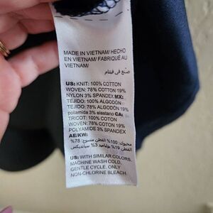 This is a short sleeved t-shirt by Chico's. It is two tone dark blue made with mixed materials, and has a high low style hemline.