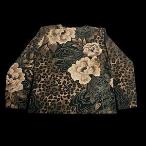 Stylish 3/4 length shirt with a floral and leopard print design. Features beige and black colors.