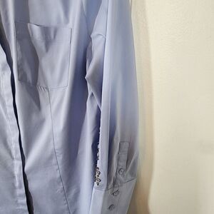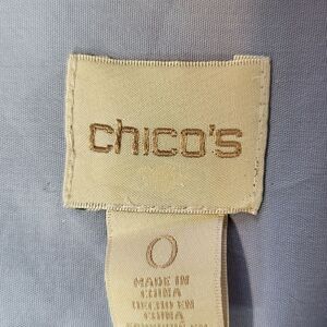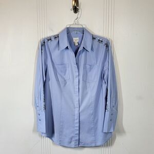 Chico's light blue embroidered blouse. Chico's size 0 (4). Buttons up in the front with two front pockets. Embroidery on each sleeve.