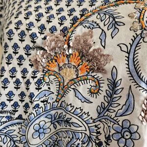 This is a short sleeved shirt by Chico's. It features blue, white, and black paisley and floral print with sequined accents.