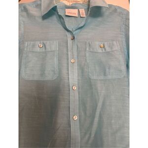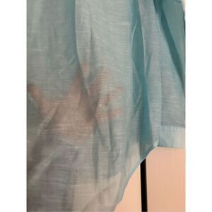 Light and airy turquoise blouse. Rayon and nylon. Roll tab sleeves. Back placket. Pit to pit measure is 20 inches. Length is 27 inches in front and 28.5 inches in back. Chico’s size 1.