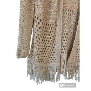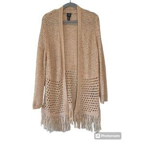 Chicos Size 2 (12/14) Sweater Womens Pink Cardigan Shimmer Open Knit Fringe Fron