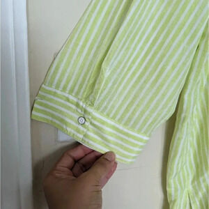 Chico’s Size 3(US XL) Silk Blend Stripe Shirt Green Snap Button Curved Hem