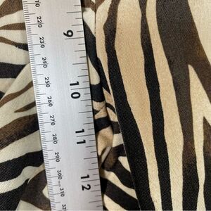 Chico's So Slimming Zebra Print Crop Pants Size 0.5. Good pre-owned condition. Brown and cream tone design. Pull on pants with elastic waistband. Back waist has two areas of loose hem. Otherwise great condition. Small slit at bottom cuffs. Measures approximately waist 30", inseam 23", rise 10".
