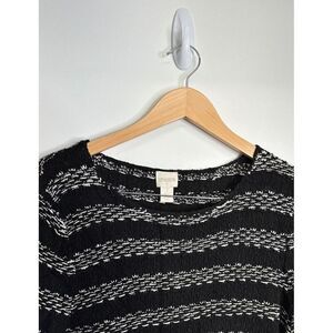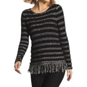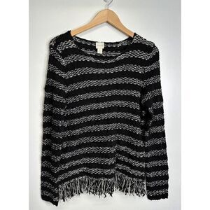 Keywords: Chico's sweater, striped sweater, fringe hem, textured knit, pullover sweater, black and white sweater, bohemian sweater, casual sweater, long sleeve sweater, women's sweater, knit top, size 1, Chico's size 1