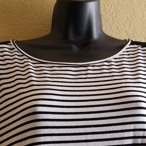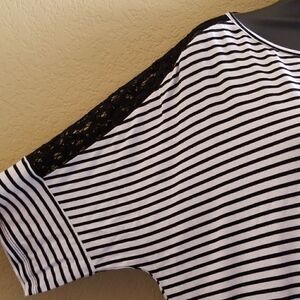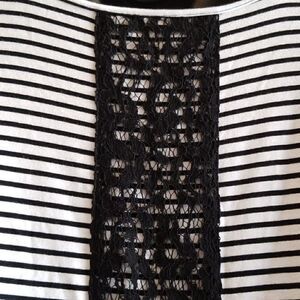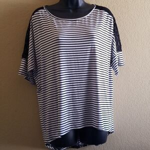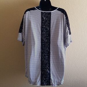 This is a black and white striped Chico's tshirt with lace detailing on the shoulders and back. See the size chart for Chico's sizing :-)
