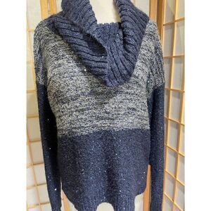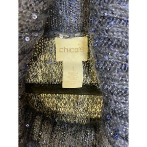 Absolutely gorgeous cowl neck sweater from Chico's. Size 1, corresponds to small or 8. Sequined accent. 50% polyester, 49% acrylic, 1% metallic. Machine washable. Made in China. Excellent condition. Nonsmoking home.