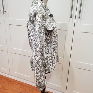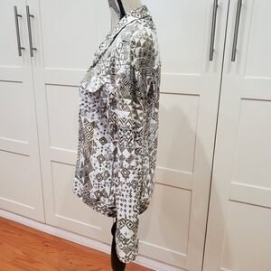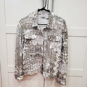 Chico's Top Lightweight Jacket White Tan Gold Silver Button Down Long Sleeve M Size 1