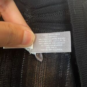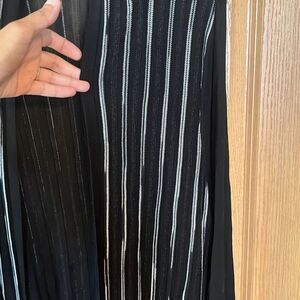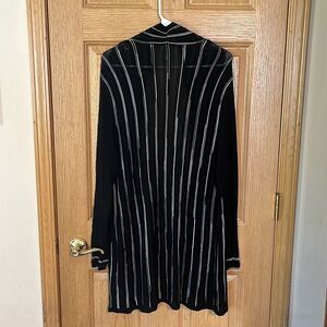 This sweater is made by Chico’s for their Travelers line. It’s a black longer length striped cardigan with a subtle metallic sheen. Chico’s size 3 (see size chart) and in wonderful pre owned condition. Smoke and pet free home.