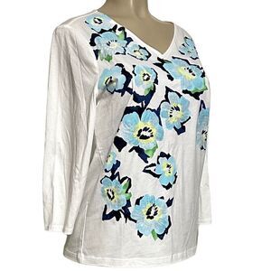 Chicos Women's White Floral Sequin V Neck Long Sleeves Tee Shirt Size Medium NWT