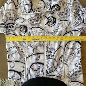 What I Love About It: Versatile jacket in a black and white "paisley" type print. Polished polyester makes it a great windbreaker. Long Sleeves but has tabs that can utilized to roll the sleeves up. Excellent piece from Zenergy!