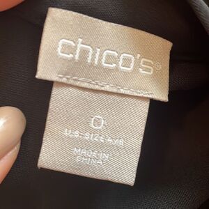 Chico’s black polyester blouse with bell sleeves & half moon cutout at neck