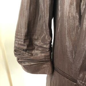 Chico’s blazer. Size 3. Truly Texture Liza. 3/4 ruched sleeve. The color is a shimmery gray. Two button closure. 2 working front pockets. Fully lined. Length from shoulder to bottom is 26”. Armpit to armpit is 21.5”.