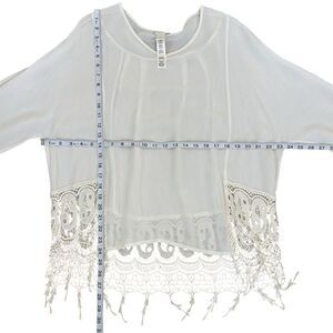 Chico’s ivory lace trim flowy top size large. Easy to dress up or down. Excellent preowned condition see photos for measurements and fabric content