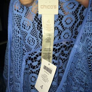 Brand new, light blue blouse with crochet, see through back and shoulders. Approximately 25 inches from armpit to armpit, 36 inches long. From a pet and smoke free house. Happy to bundle!