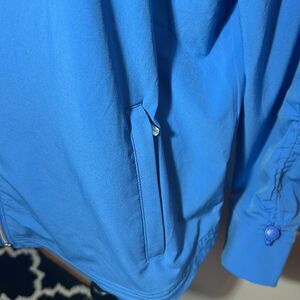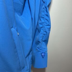 Very good condition, smoke free. Freshly laundered. Chico’s size 2 or large equivalent (12/14). Lightweight jacket. Pockets at the sides. Adjustable length sleeves as shown in the photos with a pull cord.  the color is slightly lighter blue than the photos are making it look. The one lying on the bed showing the chest measurement most closely shows the color.