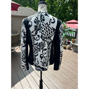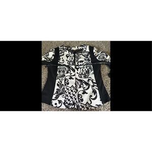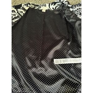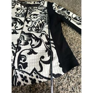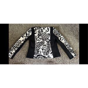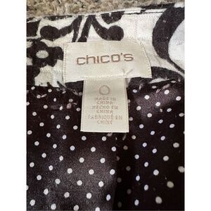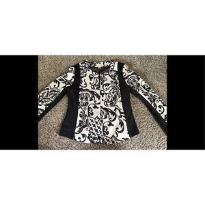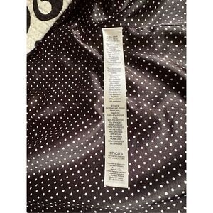 Beautiful Chicos, black and white open jacket/blazer polkadot lining , Chicos size 0 . Chicos has their own sizing. I believe this is a small.