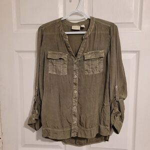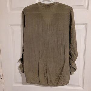 Really nice shirt. Made of rayon materials. Lightweight and flowy. Feels very silky. Tag says size 0. Measurements indicate size medium. Please check Measurements before buying. One flaw on bottom of the shirt. Tucked in will not be seen.