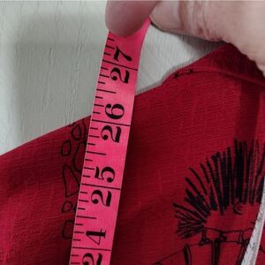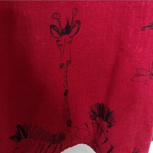 red, silk, shirt jacket, button up. print is animal drawings. sleeves roll up and button. pit to pit 23" length 26"