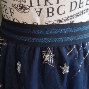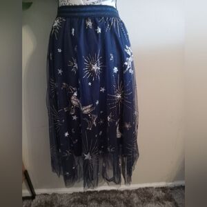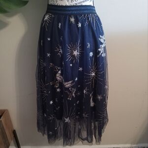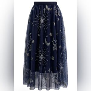 Chicwish Mysterious Night Moon and Star Embroidered Mesh Tulle Skirt in Navy