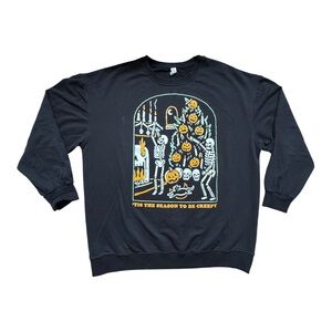 Celebrate spooky season in style — this Chicyea sweatshirt features skeletons decorating pumpkins, with the phrase “’Tis the Season to Be Creepy.”